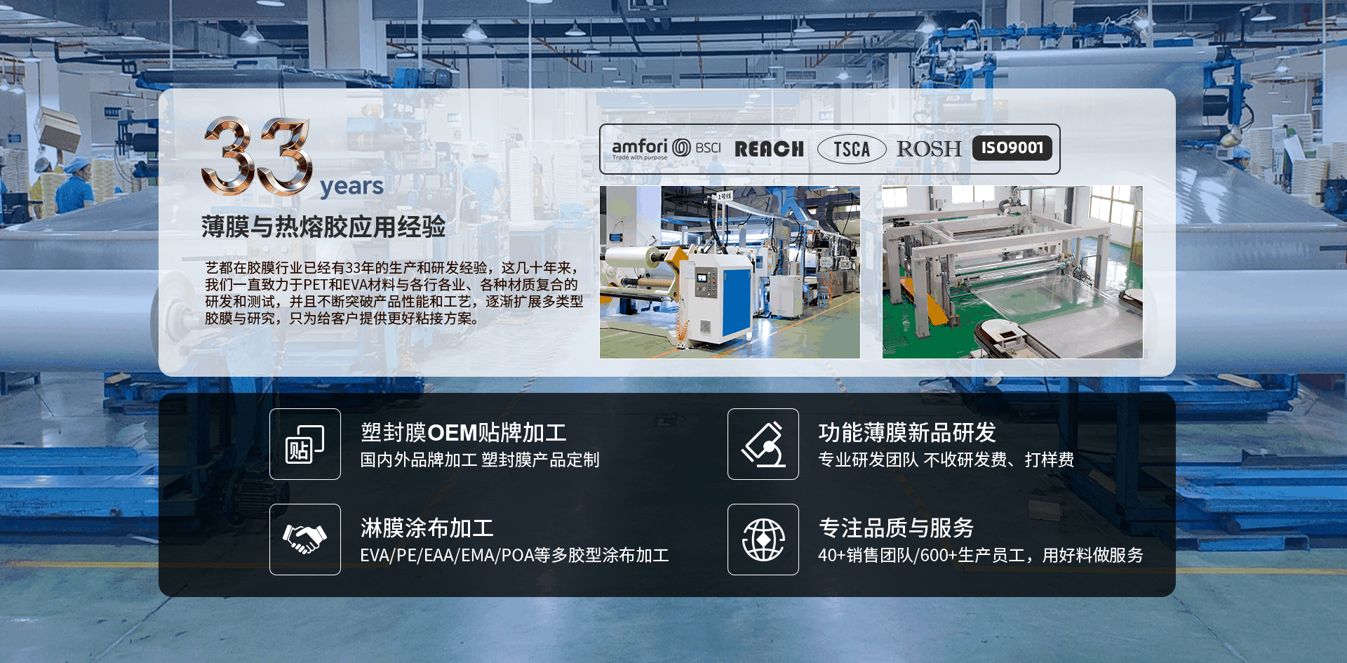 惠州艺都公司成立于1993年,是塑封膜、预涂膜、带胶PET热熔胶膜、饰面膜及功能型热熔胶膜等功能薄膜类专业生产厂家、国家高新技术企业。艺都现有三大生产厂区,分别位于惠州惠南,惠州仲恺及越南太原。自有厂房15万平方米,专业生产线100多条,自研发专利证书70多个,年产量5万多吨,年出3000多个货柜。