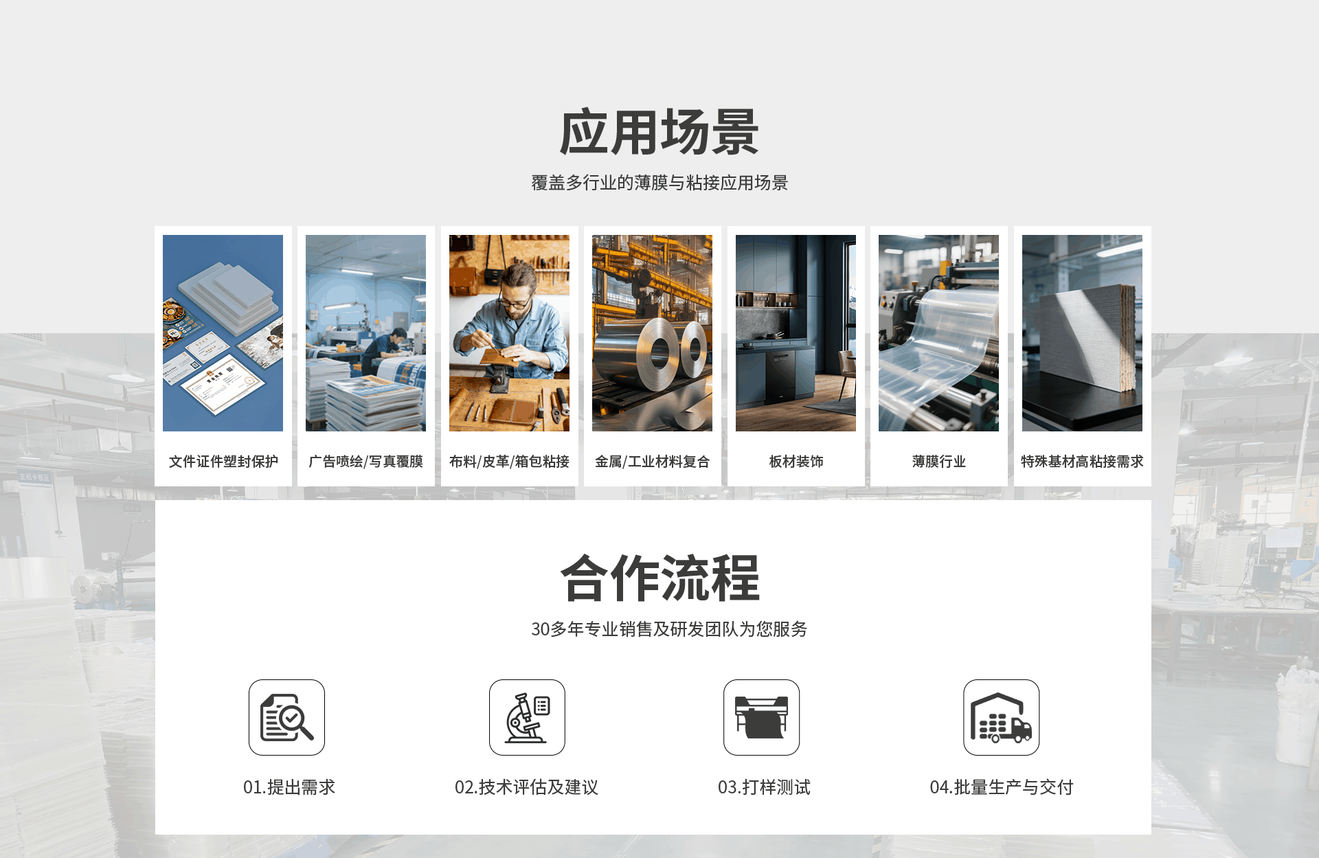 欢迎各界朋友前来洽谈塑封膜跨境贴膜加工,热熔胶淋膜加工,功能型热熔胶膜新品研发等业务。